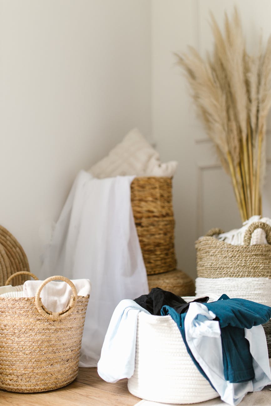 Use stylish baskets to store items like throw pillows, blankets, or children’s toys. They can easily be tucked away in corners or under side tables, maintaining a clean appearance.